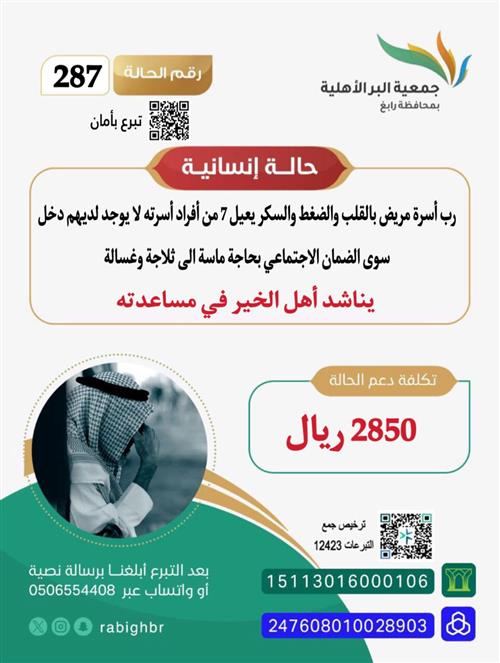 رب أسرة مريض بالقلب والضغط والسكر يعيل 7 من أفراد أسرته لا يوجد لديهم دخل سوى الضمان الاجتماعي بحاجة ماسة الى ثلاجة وغسالة يناشد أهل الخير في مساعدته